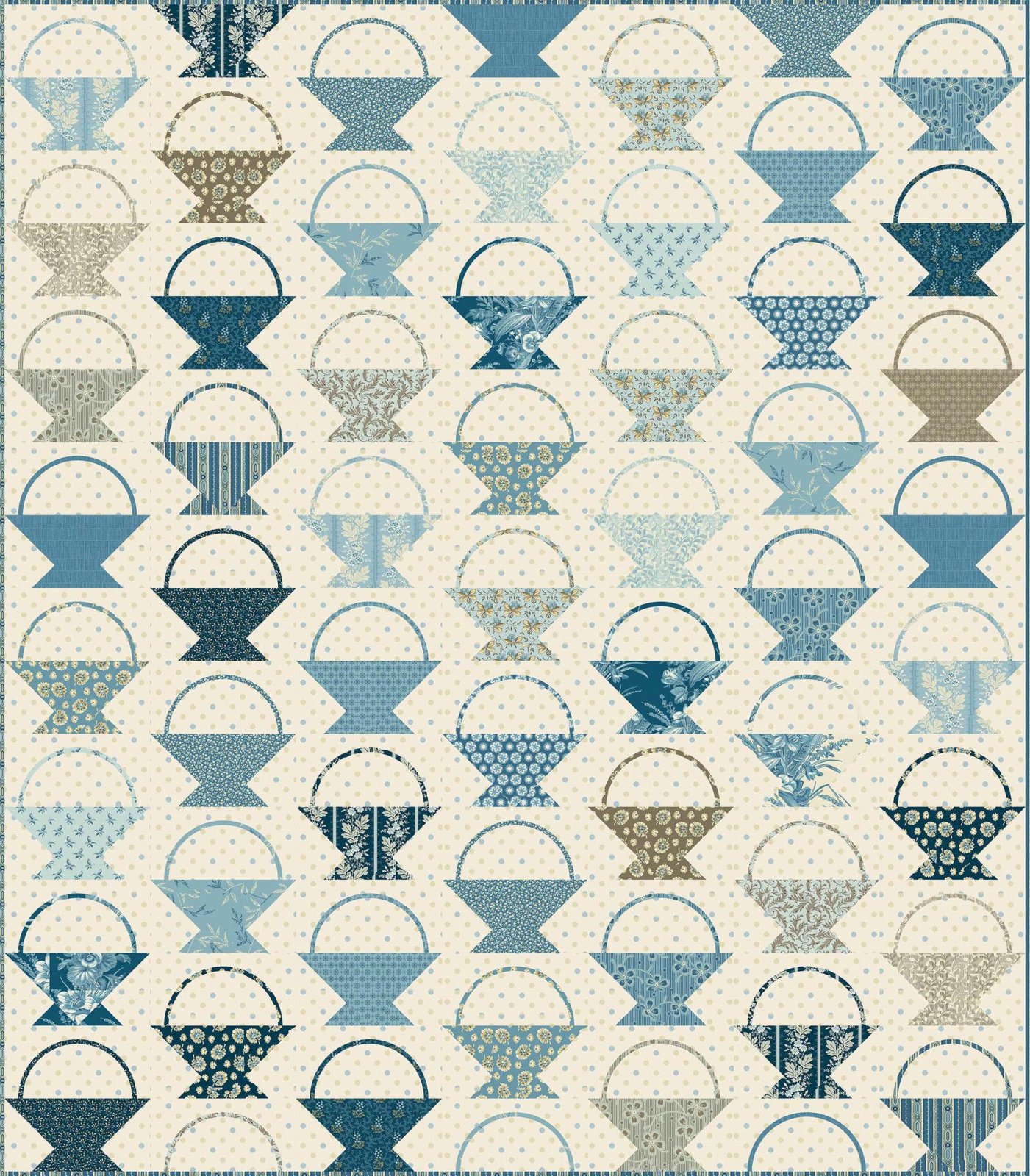 Gift basket Pieced and applique quilt The applique is only the handles of the baskets. . This quilt is 56 x 64 and Sally chose tilda fabrics - you can choose what works best for you. This is really a beautiful quilt.